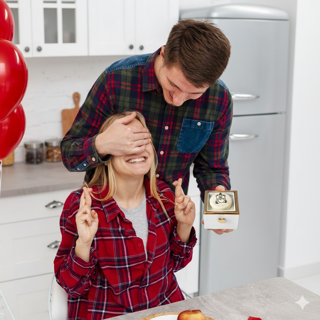קופסת ההפתעה שלנו מסתובבת ברגע קסום וחושפת טבעת אלגנטית שמסתתרת בפנים כל פרט בעיצוב יוצר רגע בלתי נשכח שילוב מושלם של אהבה יוקרה ורגש המתנה שתמיד משאירה את כולם בלי מילים